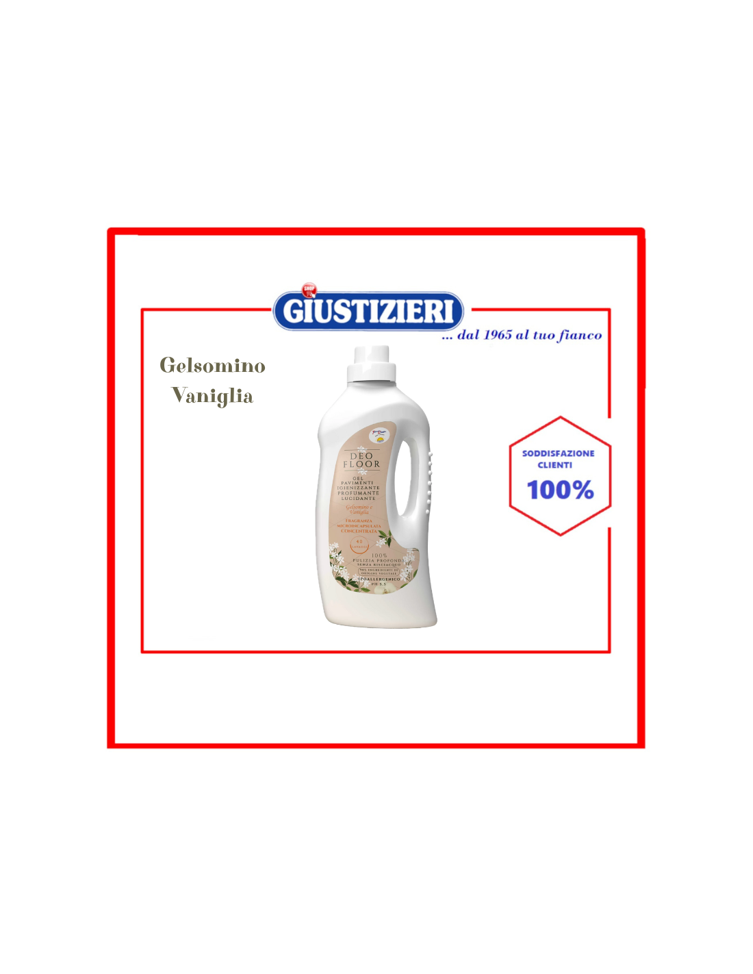 Un solo tappo bastera‘ per avere un pavimento lucido pulito, igienizzato e super profumato, grazie al lento rilascio della fragranza. Il pH neutro dermocompatibile, lo rende, ideale per ogni tipo di superficie pavimento, specifico su marmo, parquet, gress porcellanato, ceramica e per qualsiasi altra superfice lavabile, senza aver bisogno di risciacquare, riducendo i tempi per la pulizia. L’essenza gelsomino e vaniglia è arricchita con oli essenziali di gelsomino nella dolcezza della vaniglia, profuma ed elimina eventuali cattivi odori, garantendo anche un potere igienizzante naturale.