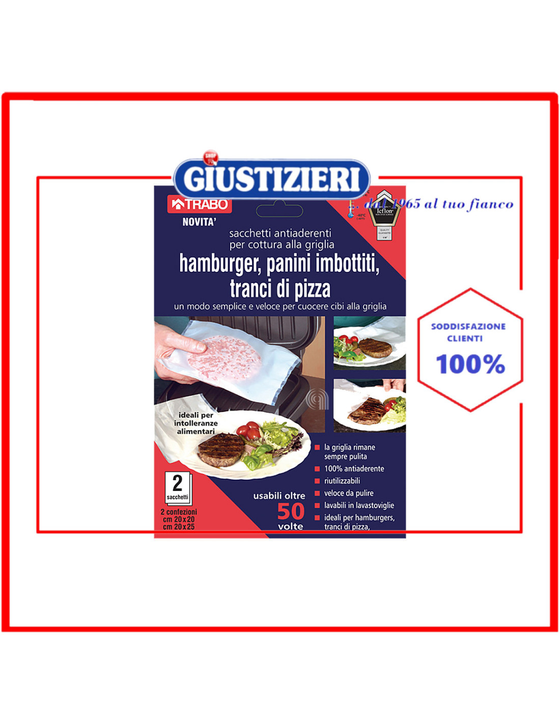 Busta in Iciflon per cuocere sulla griglia hamburger, panini imbottiti, tranci di pizza, etc. senza sporcare. Antiaderente al 100%. Riutilizzabili fina a 50 volte. Confezione di 2 buste da 20x20 e 20x25 cm Made in UK. Lavabile in lavastoviglie.