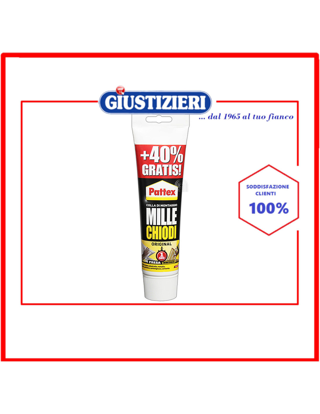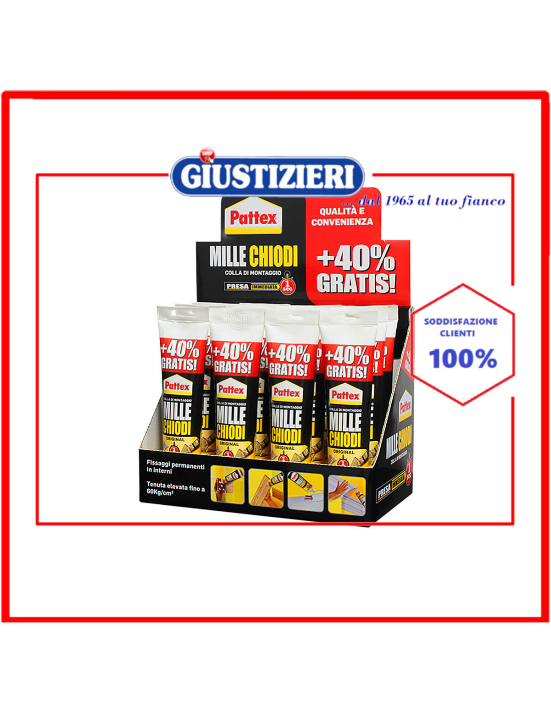 Pattex Mille Chiodi Original è l'adesivo di montaggio che elimina l'uso di viti, tasselli e chiodi, ed è caratterizzato da una notevolissima forza adesiva iniziale con un effetto ventosa. Può essere applicato anche su superfici umide, rimane elastico nel tempo e non emana alcun odore. Oggetti riposizionabili fino a 10 minuti. Regge fino a 60 Kg/cm2. Tubo da 250g + 100g in omaggio. Ordinando 12 pezzi si riceve l'espositore da banco gratuito.